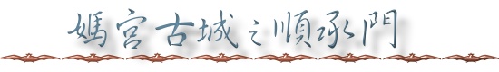 中法議和後,清廷感於澎湖實有設防的必要,因而築城之議四起,乃於光緒十二年〈西元一八八六年〉十二月,由總兵吳 宏洛督建,立時兩年,光緒十五年〈西元一八八九年〉十月竣工,總工程費約二萬三千五百餘兩。牆厚二丈四尺,為台澎地區城坦最厚者,並以染紅的螺殼灰粉塗抹,作為保護之用;日據期間乃有「海底龍宮」之稱號。 媽宮城設東、南、西、北及小南、小西六門,六門各有其名稱:東門為朝陽門,西門為大西門,南門為即敘門,北門為拱辰門,小西門即順承門,小南門為迎薰門。 |